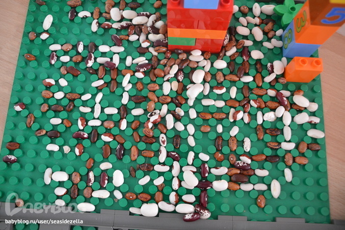 В этот раз Матвей сам себе усложнил задание высыпал фасоль на основу лего, а из нее не так и просто было вытащить фасоль, но ему удавалось, а потом он ее грузил на самосвал и перевозил!