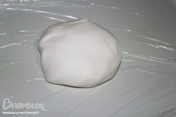 У меня было 125г.ПВА, крахмала ушло больше, чем 125г., всыпала наглаз, столько сколько тесто смогло взять, чтобы руки не прилипали и можно было лепить!Вместо вазелинового масла взяла детское масло и вместо вазелина-детский крем.Вот такой вид имело тесто после замешивания!