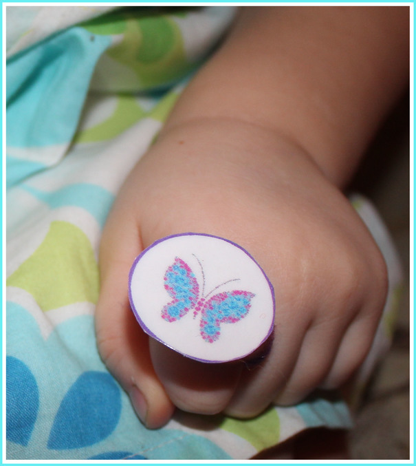 А было все так: она взяла снежинку на липучке от нашего календаря погоды, прицепила на резинку для волос, надела на пальчик и радостными криками известила меня о своем изобретении ))