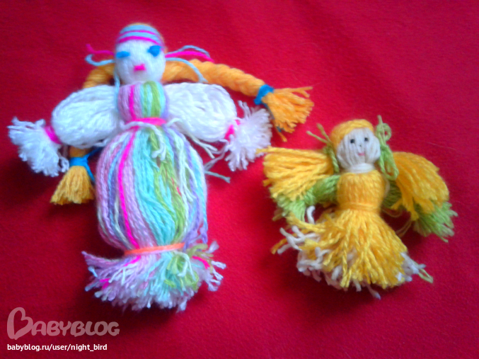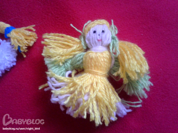 Птичка наматывала нитки на руки ну остальное, к сожалению делала я сама, не захотела дочка творить. Но играет с удовольствем. А мне приятно что она играет не только покупными, нои такими "теплыми", включающими воображение девочками))) мы про них еще будем гворить на нашей ТН "куклы". Ну у нас не ТН а ТВ скорее(тематические вечера)