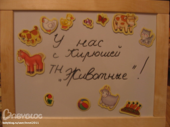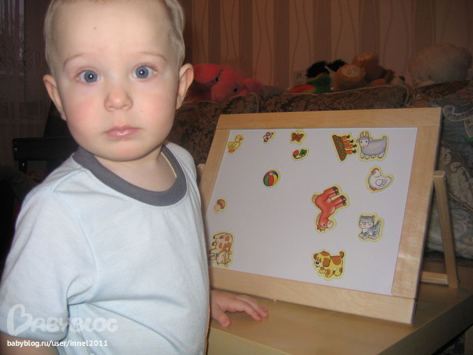 7. Всем рекомендую магнитную доску! мы купили небольшую, с одной стороны магнитная доска, на которой можно в т.ч. писать спец маркером. с другой- обычная доска для рисования мелками. Мы на магнитной рассматриваем картонные магниты-животные (покупала на лабиринте, тематика дом, животные, природа)