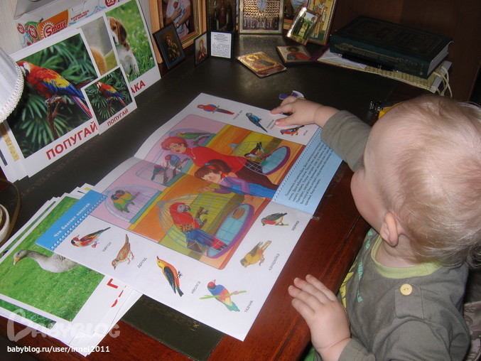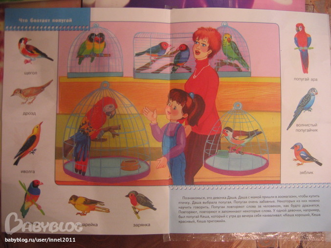 Самая любимая страница Кирилла- с попугаями, он просил открыть только эту страницу) потом бабушка достала нам журнал с попугаями)