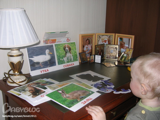 2. Кирилл, конечно же, как любой полуторогодовалый знает животных и их звуки, достаточно много, знает их по картинкам, узнает на улице, в книжках, в мультфильме, ТВ и т.д. Поэтому, раз у нас есть разные-разные карточки, то попробую научить его новым животным