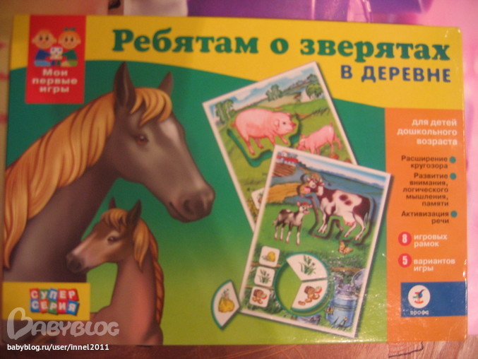 5. Развивающая игра животные в деревне. Для нашего возраста мелкая, карточки хочется большего размера. Но сама я планировала сделать Кириллу свои большие карточки мамы и детеныши, животное и что оно кушает, а на лабиринте нашлась такая игра)