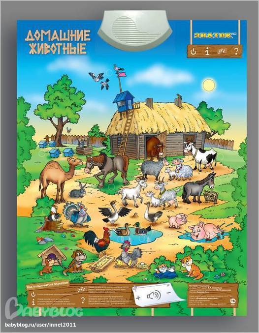 9. И наконец тоже наш давний друг- Музыкальный плакат Домашние животные (Знаток). Прекраснейший плакат, подходит на несколько лет, поскольку с заданиями разной сложности. Мы сейчас просто рассматриваем животных и нажимает кнопку рядом и слушаем звуки