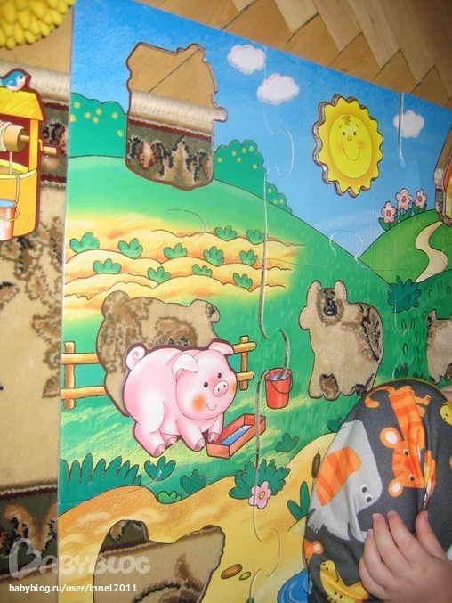 Кирюша собирает только фиолетового кота и то с моей помощью) Позже он начала собирать и других животных, конечно, но в полтора года фаворитом был кот) Пазл картонный, легко рассыпается, собирается только на столе. В коробке: кот, собака, лошадь, поросенок, осел...