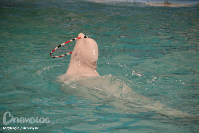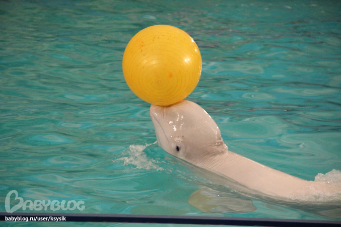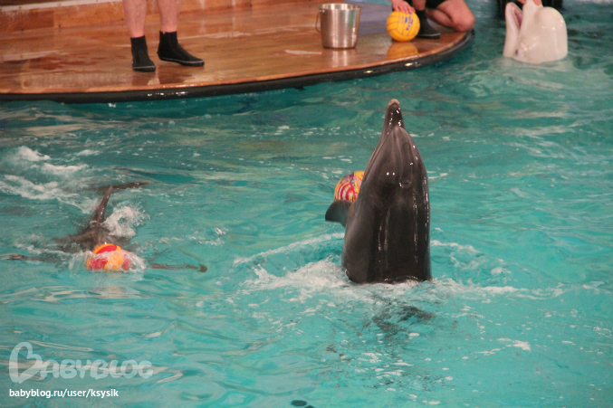 Продавали вот такие мячики по 100 руб. Вконце прдставления по команде ведущей нужно было кинуть мячик, и чей мячик первым принесет дельфин тренеру тот выиграл бесплатную фотографию))) мы не выиграли(((