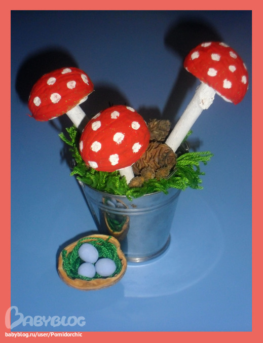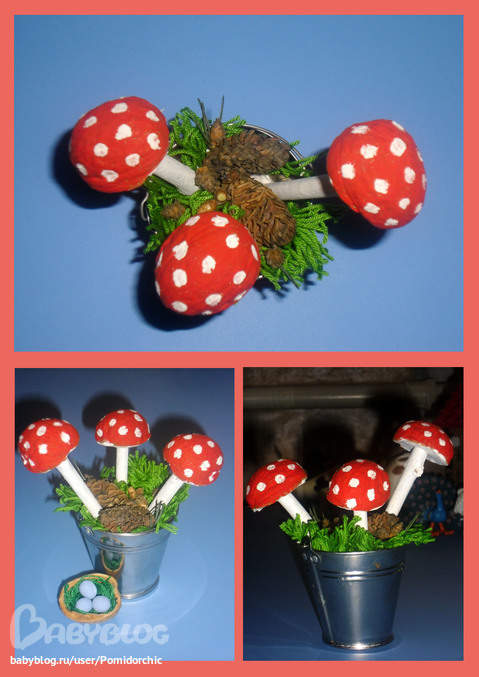 Появились у нас такие мухоморы, посадили мы их в ведерко (где-то видела такие в цветочном горшочке)