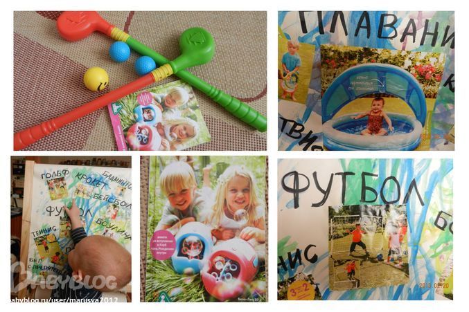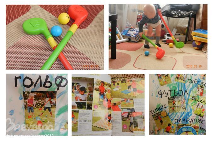 На радостях мы повырезали из каталога фото с видами спорта и наклеили на наши рисовалки, название спорта подписала маркером. Теперь подбегает к мольберту и называет Гольф, футбол - это любимые))) Хоккей надо добавить. В общем, вот так мы познакомились с гольфом.