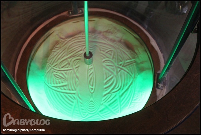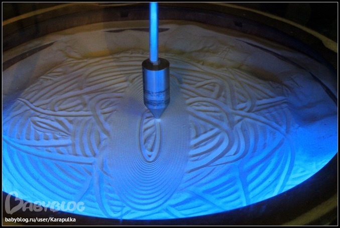 Большая стеклянная колба с песком и маятник, который можно раскачать и он будет рисовать причудливые узоры)) Очень занятная вещь!)) Не хочется отходить.
