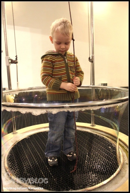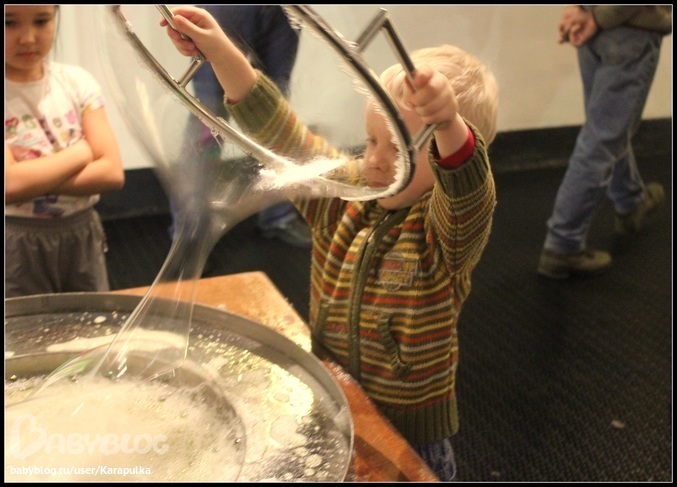 Отдельная мыльная комната. Несколько приспособлений для выдувания огромных мыльных пузырей. Дети все в восторге)