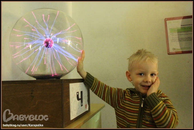 Плазменный шар. Или по другому - шар Теслы. Очень красиво. Завораживает. Рядом с ним написано, что если одной рукой потереть его, собрав в кучу несколько разрядов, а другой рукой дотронуться до стоящего около тебя человека, то почувствуешь разряды тока. Несколько раз мы с Андрюшкой пытались это осуществить, но как-то безрезультатно)