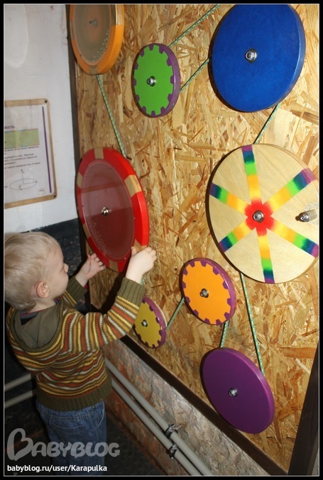 Тут можно покрутить одно любое колесо, и с ним вместе будут крутиться все остальные, потому что они соединены все друг с другом тросом. Эффект шестерёнок.