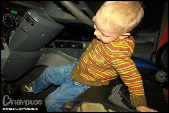 Настоящая кабина КАМАЗА. Огромная, тёмно синяя, красивая. Жаль, снаружи не сфотографировала. Можно залезть и всё потрогать-покрутить.