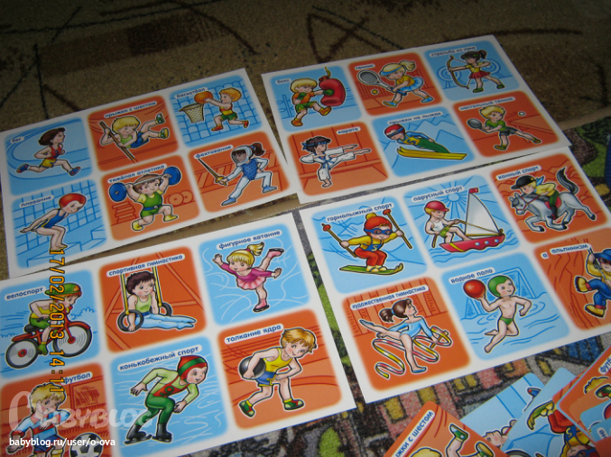 В игре четыре поля формата A4, и карточки к ним. Конечно, если вы не знаете, чем например, занимаются художественные гимнасты, перед игрой с ребенком лучше немножко подготовится и почитать на эту тему. Я пока рассказываю ему то, что знаю сама. Планирую сделать на обороте карточек краткую информацию о каждом виде спорта, а если найду и загадки. Их Кирюха любит) Просто распечатать маленькие фрагменты и наклеить. Но можно и без этого играть, это я уже углубляюсь)))