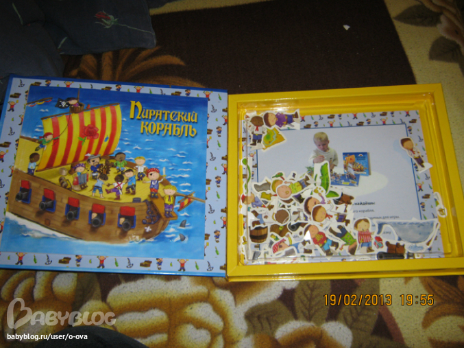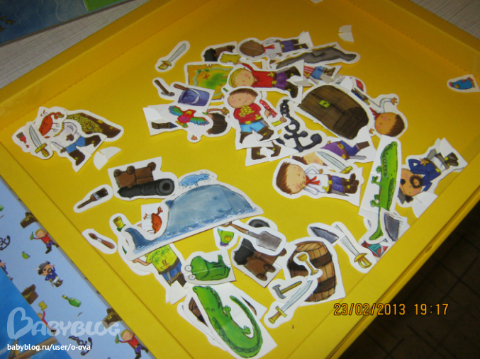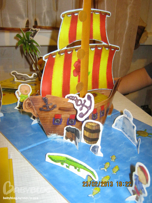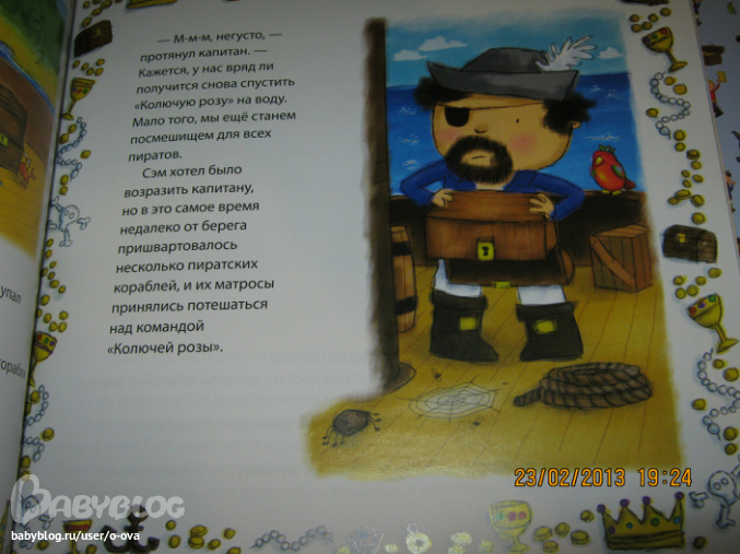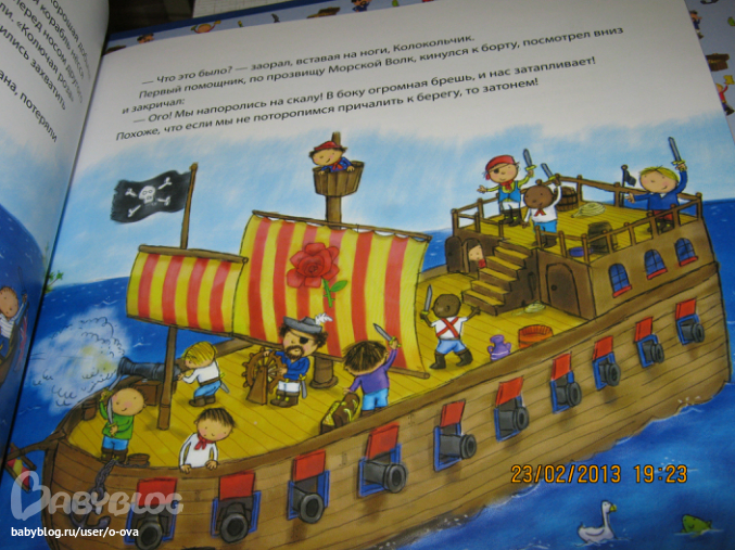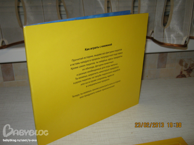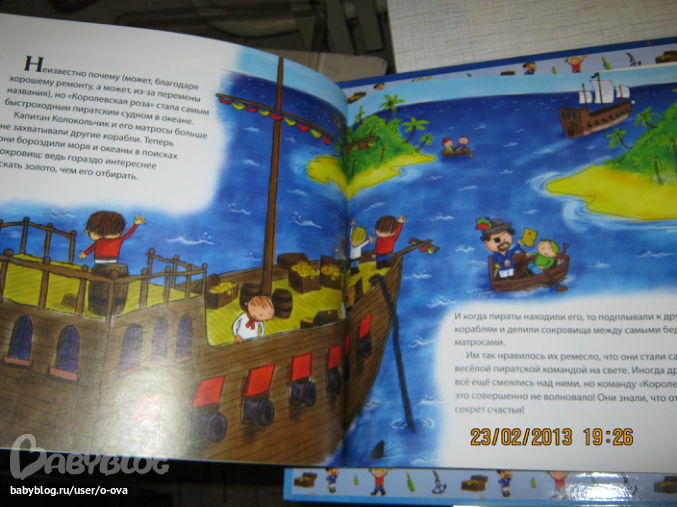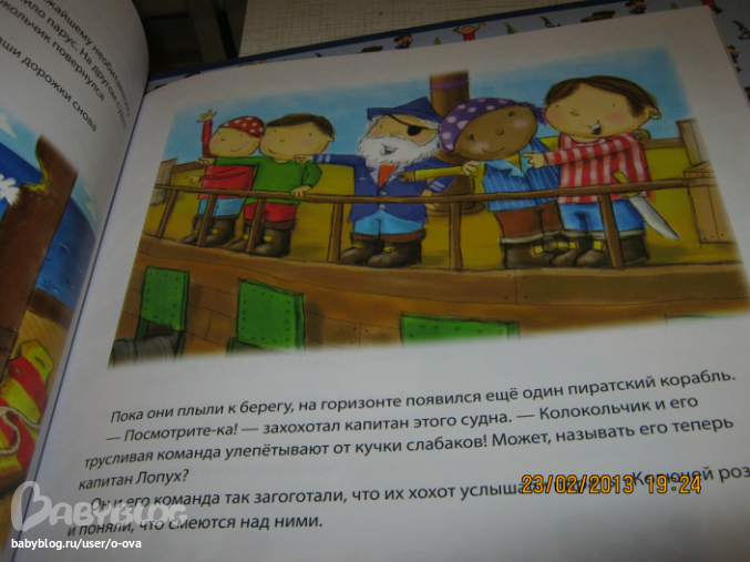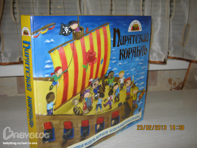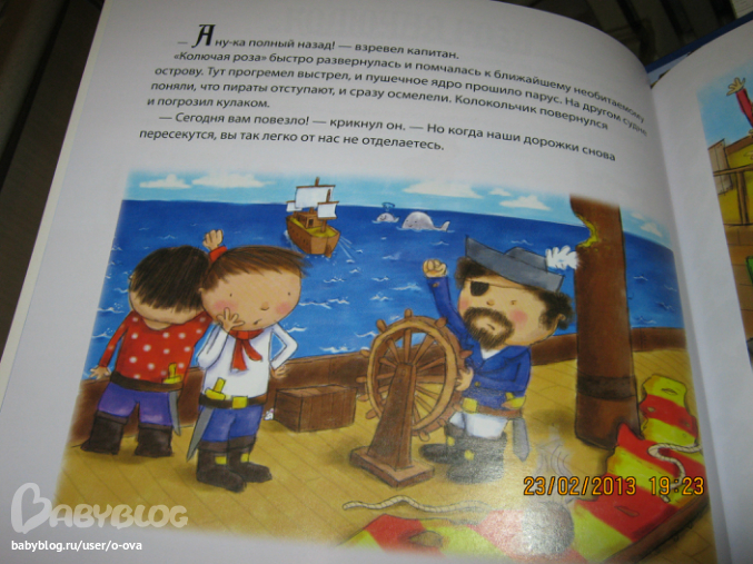 Вообщем - это не столько книжка, сколько игрушка. Но игрушка очень прикольная. К обложке приклеена небольшая книга в тонкой обложке с историей про пиратов. Книжка вполне детская по содержанию. Одни названия чего стоят "капитан Колокольчик", например) Содержание примерно такое: