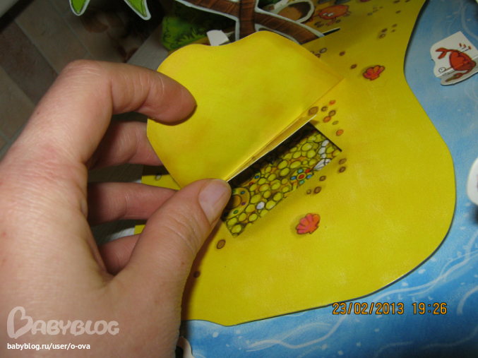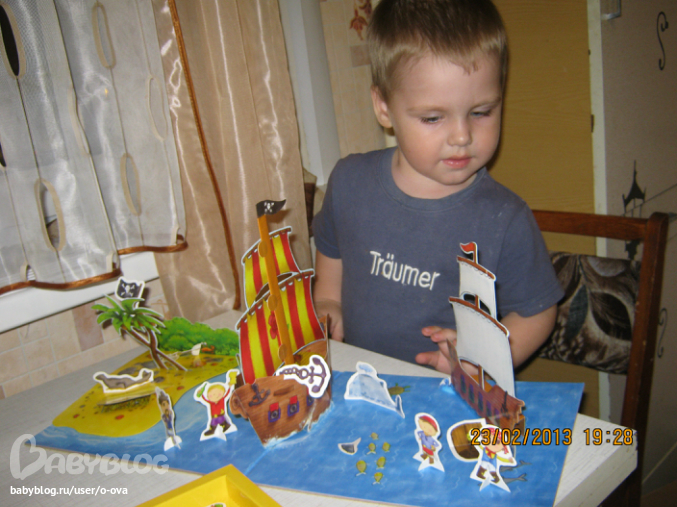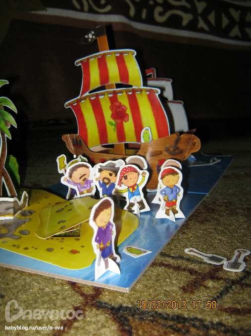 Теперь самое интересное. На самом деле это не книга - а коробка. Книжка с историей на одной стороне обложки, а на другой вкладка, там лежат картонные фигурки пиратов и всякие аксессуары к ним (сундуки, лопаты, флаг, попугай и т.п.) Плюс там же лежит еще одна картонная книжка, которая при развороте превращается в книгу-панораму. На ней море - пиратский корабль, судно торговцев и остров. На острове есть место, где закопан клад, его можно открыть, а там внутри сокровища.