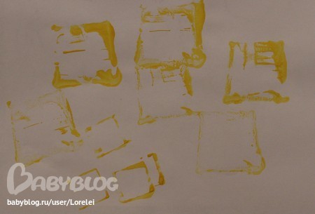 Я дала краски, кисточку, кубик и квадратную деталь от конструктора. Намазали краской и отпечатали на бумаге квадратики: