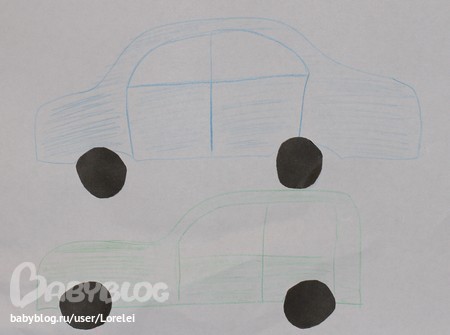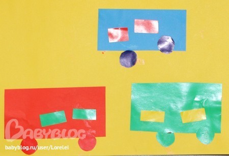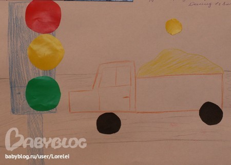 2.приклеить на светофор кружочки, машине колеса и солнышко: