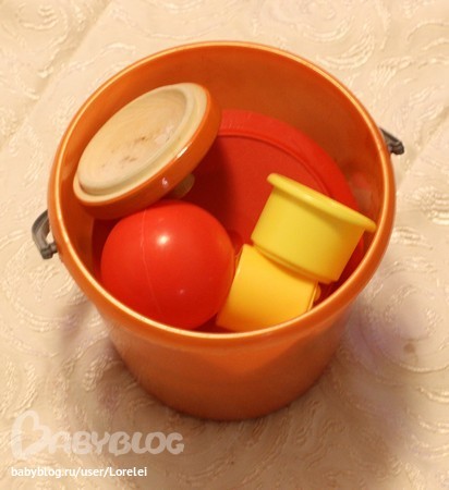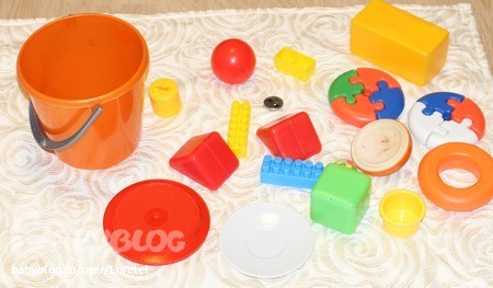Я взяла ведро с круглым отверстием. Разложила разные предметы и попросила малыша сложить в ведро все что у нас напоминает круг и все то, что у нас круглое, т.к. эти два понятия все же разные.
