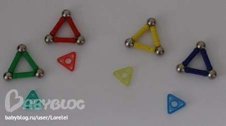 Использовала магнитный конструктор. Задача была, чтобы малыш правильно по цветам вставил пластмассовые треугольники: