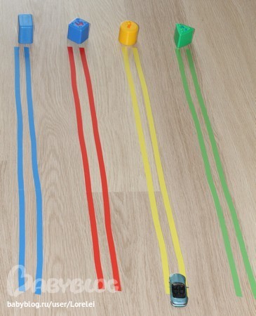 Сдалала вот такие дорожки из изоленты, и малыш должен был подвезти свою машинку к форме, которую я называла.