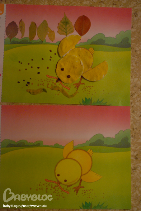 Лес из гербария, цыпленок из ватных дисков, червячки из пластилина, пшено и глазки ватной палочкой.