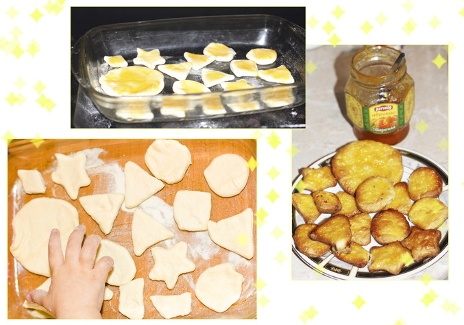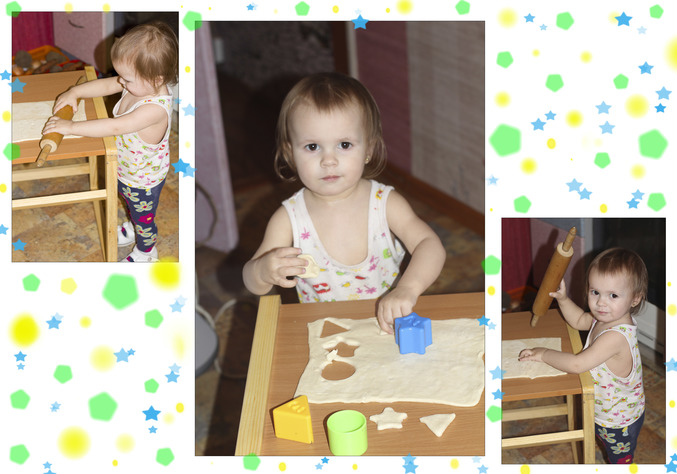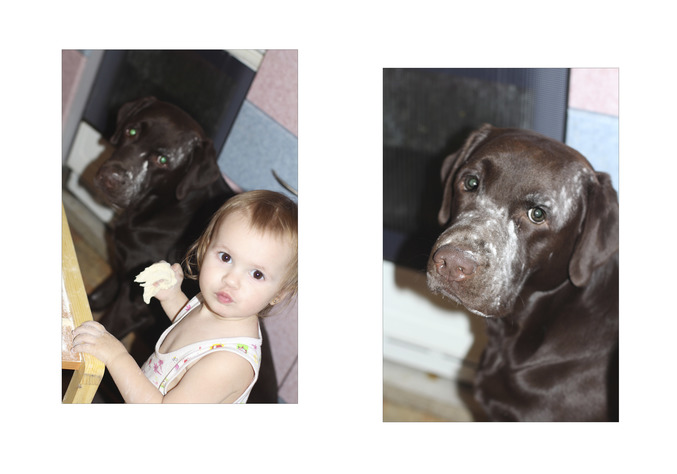 И еще мы пекли печенье, Аришка нарадоваться не могла. Пекли уже совсем вечером в воскресенье, чтобы хорошо завершить недельку. Так вот Арина даже спать не легла,пока печеньки не испеклись) Бегала к духовке со мной проверяла их все) Хозяюшка моя любимая) И наш Шокки прошел боевое крещение мукой) Смотрите сами)