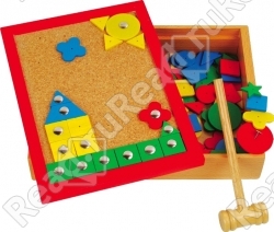 Маленький гвоздик не так то просто вставить в дырочку, а уж про молоточек и говорить нечего, кто из детишек не любит постучать?) Правда я Арину просила сначала пальчиком придавливать гвоздик, а потом молоточком стучать - так пользы больше)