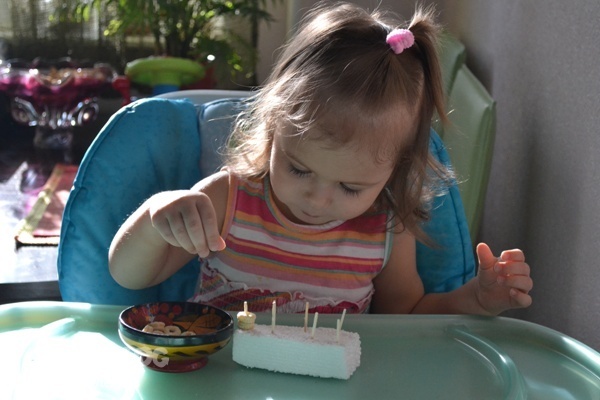 Распотрошив трое спичечных коробков, спичек осталось уйма. Так что буду теперь везде их применять. Вот и сегодня воткнула в пенопласт и дала сладкие колечки. Развиваем мелкую моторикуи счетаем насаженные колечки