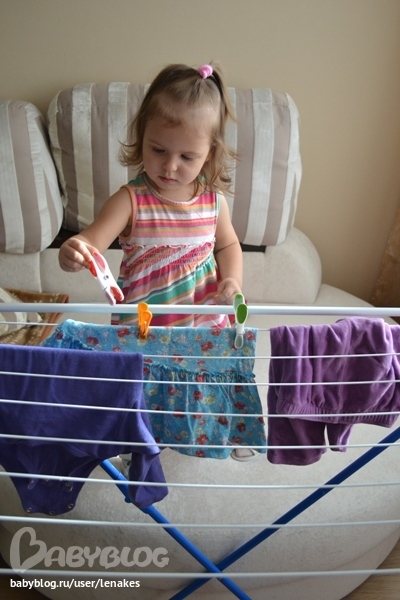Потом перешли уже к серьезным занятиям. А именно развешивать белье. Сразу скажу, ничего не получилось. Все падало на пол. С помощью мамы, конечно, было все повешено. Ну и что бы ветром не сдуло, закрепили прищепками.