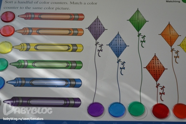 и расскладывали их по своим домикам. С карадашами справилась хорошо, а вот с воздушными змеями пришлось помочь. Причем цвета подбирала правильно, а вот положить именно в кружок не хотела.