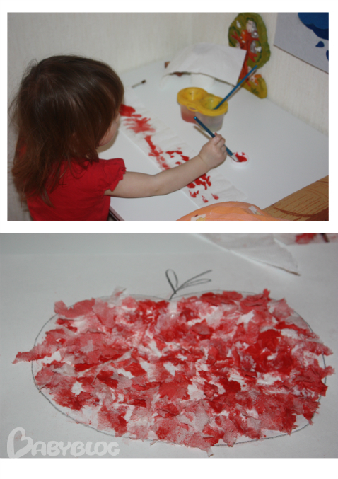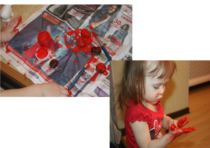 Разускрасили туалетную бумагу в крсный цвет(за неимением цвет бумаги), после того как она высохла занимались апликацией- скорее я, Настя пару раз подбежала посмотреть, что я там такое делаю).