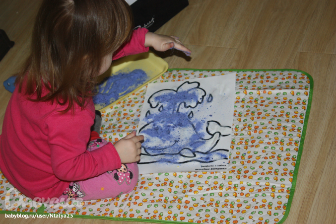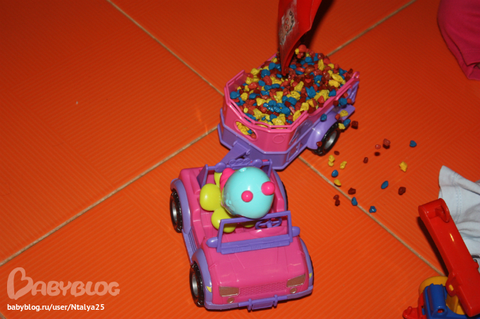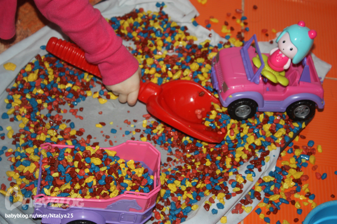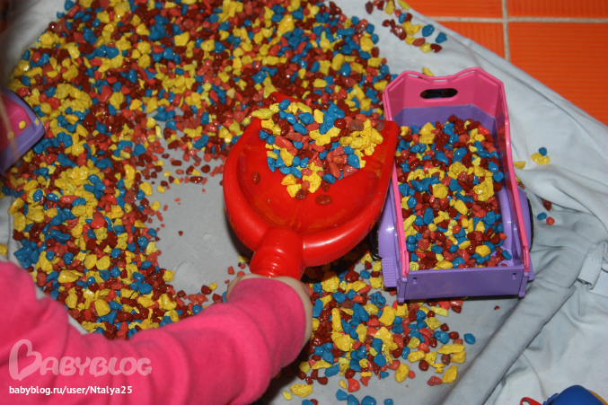 А это аквагрунт- классная штука. Настя долго игралась. Загружали в машину. Закапывали туда игрушки. при эом обращали вниманеи на цвета.