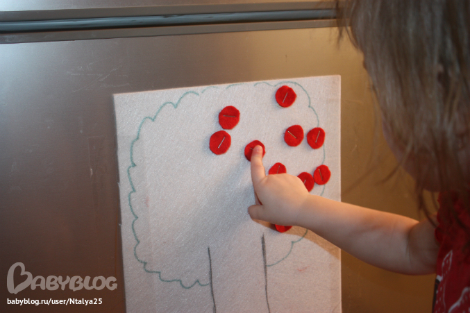Сделала дерево, на котором росли красные яблочки, тренировали пальчики - собирали урожай а потом опять вешали на дерево.