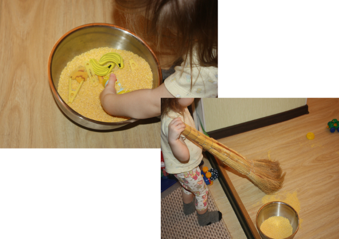 Тактильная мисочка, искали в нй желтые игрушки- вот это наверно самое любимое занятие у насти- крупы(искать в них что - то , пересыпать и т.д). конечно потом приборки много- но Настя помогает)