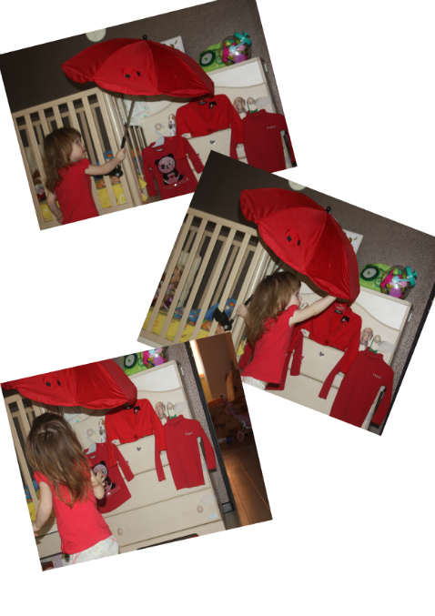 Придумала такой магазинчик - где продавались толко красные вещи и крыша в виде зонтика тоже была красной. Насте нравилось прибегать и сидеть под зонтиком. Потом она одежду то снимала то опять надевала на ручки, бегала с ней.