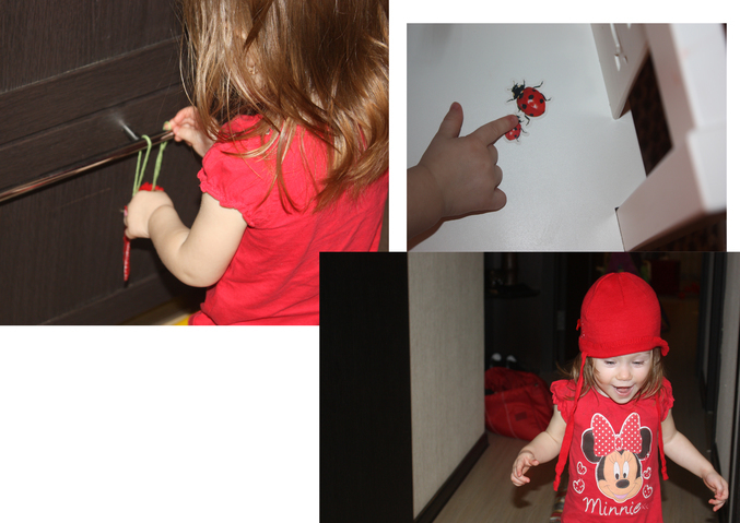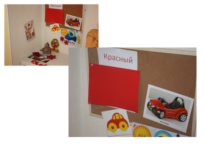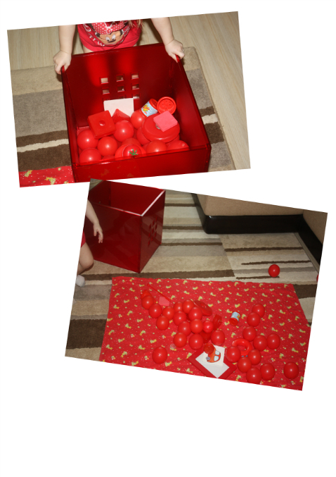 Конечно, одежда соответствующего цвета. Сложила все, что было красного в коробку. Развесила по квартире карточки.