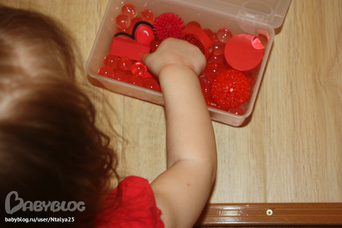Тактильная коробочка через секунду была выкинута на пол и все шарики из гидрогеля раздавлены и разбросаны по всей квартире. такое боевое настроение. Потом мы их собирали в коробку с маленькой дырочкой - получился сортер. Какая то пользя- потренировали пальчики))
