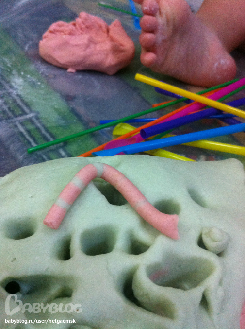 И, наконец, наши любимые червяки из трубочек, выуживать их из трубочек, а потом утрамбовывать обратно в норки ооочень крутое занятие для моторики, и очень нравится нам!!!