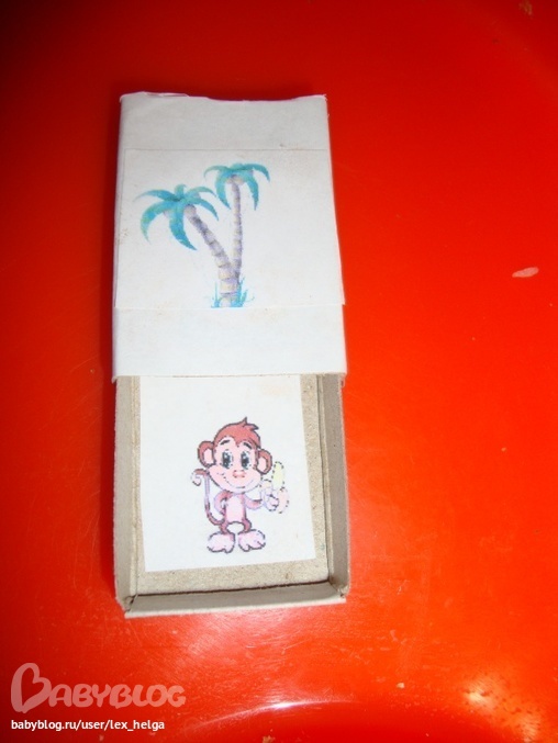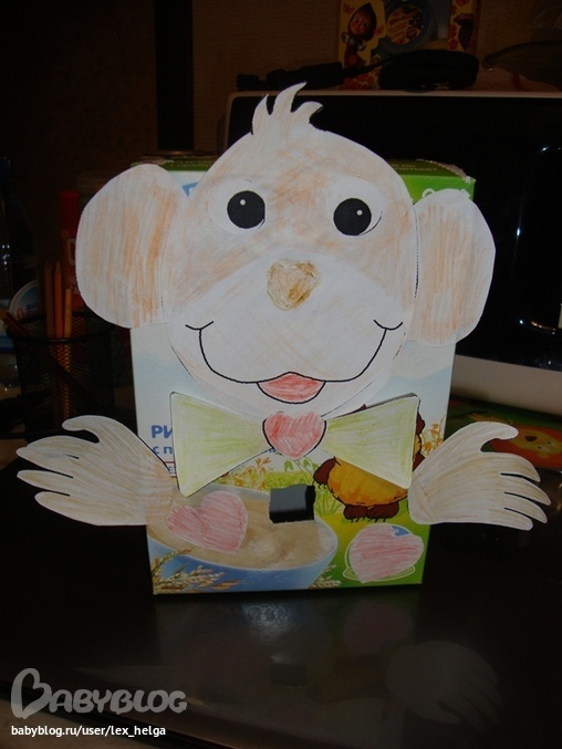 После того, как сделали, подумала, что надо было коробку бумагой однотонной обклеить, но Макс, отогнув бант и увидев Винни своего знакомого, полюбил обезьянку и кидал в отверстие фасоль, а когда вся тарелка закончилась, открыл сверху коробку и все достал, пришлось еще доставать макароны. Может быть благодаря знакомой коробке, эта обезьянка продержалась у нас всю неделю.