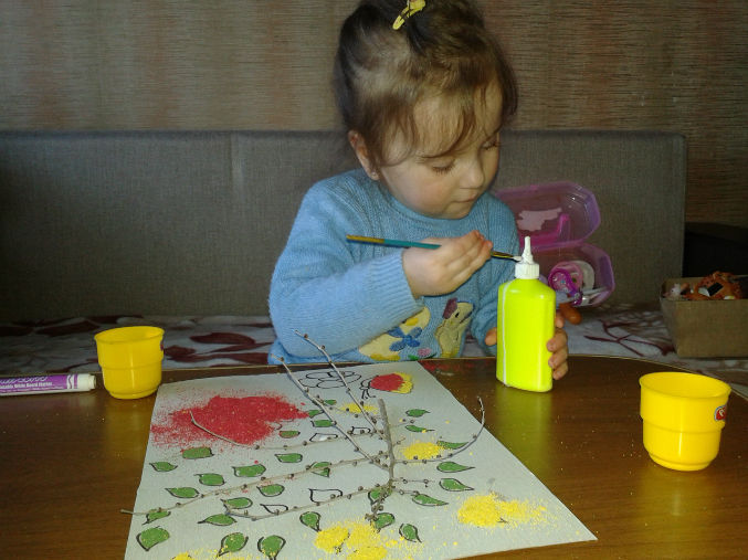 я нарисовала листочки,бабочек и цветочек,а ребенок их мазал клеем и посыпал крашенной манкой