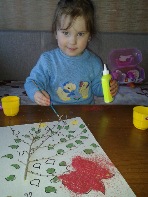 ветка приклеена к бумаге,поделка получилась яркой,интересной и что самое главное,практически полностью выполнена доченькой
