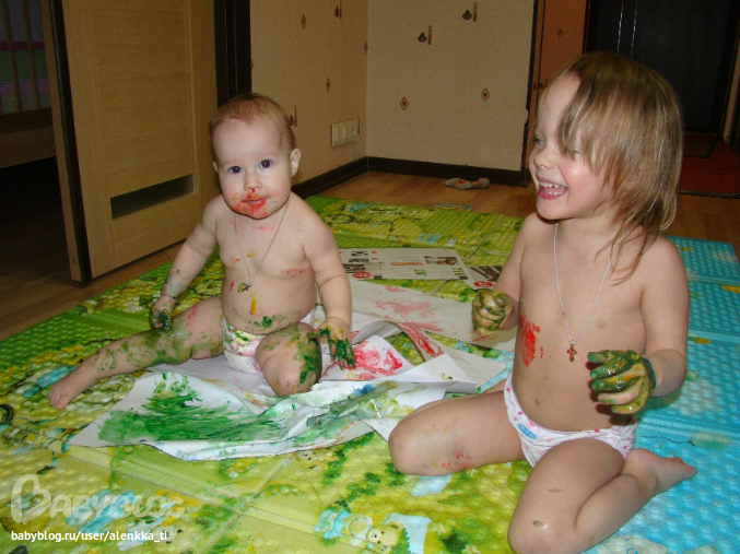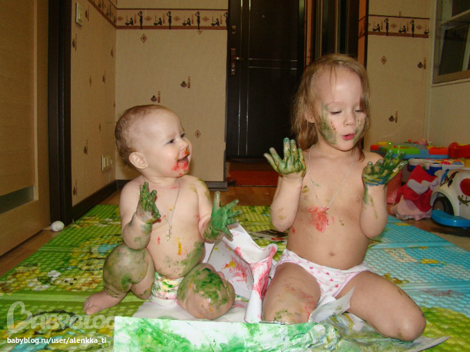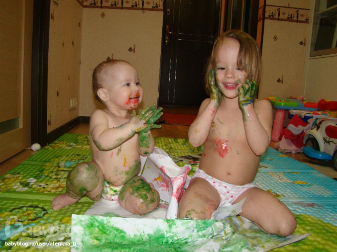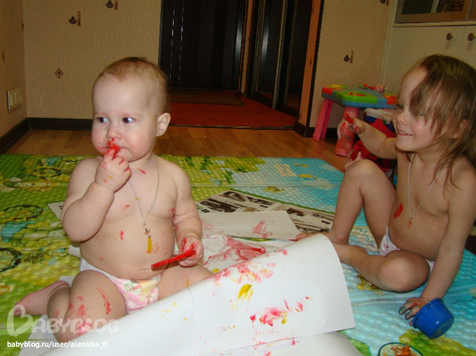 Художка ( красим, рисуем , придумываем новые способы рисовать)С Лизой мы начали рисовать пальчиковыми красками месяцев с 8.. с Валерией никак не находилось время и вот ее первый опыт :-) Сестренка ассистировала!