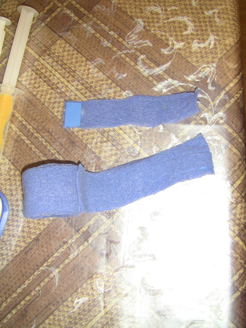 А это собственно наши бинты/лейкопластыри. Боковушка от подгузника и приклееная к ней липучка от него же. Первый кусочек смотала в валик, потом к нему последующий и так до конца. В результате получился вот такой рулончик.