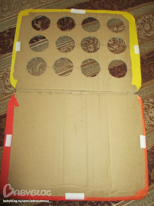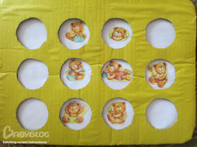 Спасибо!!!! Все просто, в саму папку кладется листик с заданием, например цвета, а малыш должен крышечками с соответствующим цветом закрыть дырочки! Те катинки в 2х экземплярах, одна на листе, которы в желтой папке, вторая картинка на крышке! Можно еще так же пары одежды, овощи-фрукты сделать и тд подробнее можно про игру и как ее мастерить ужнать на сайте картонного папы, та и набираете в поисковой строке, у него свой сайт!