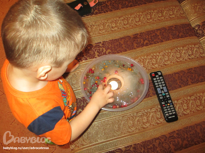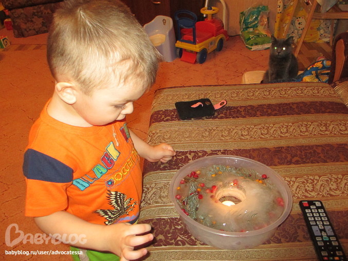 Игры и игрушки от 0 до 99 (Про игры и игрушки которые подойдут и большим и маленьким)Увидела в первый раз эту красоту у @Suvimaca и решила повторить для сына!!!!! Наливаете в большую чашку воду, туда кладете еловые веточки и различные ягоды, в нашем случае это облепиха, брусника и клюква - все для красоты! Посередине ставите стакан (не стеклянный), чтобы потом его можно было вынуть (когда вода застынет) и поставить на его место свечу! Антошка был в неописуемом восторге, целый час он играл, просил выключить свет, трогал лед, если гасла свеча, кричал быстрей верни огонь!!!!! Потом съел всю оттаявшую облепиху)))) Нарисовал нам с мужем мокрыми руками усы, бороду)))) В общем, поиграли на славу! А главное, что можно убрать в морозилку, и через некоторое время играть снова! Всем советую!!!!!!
