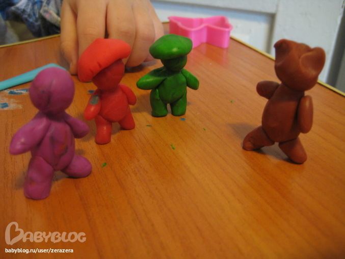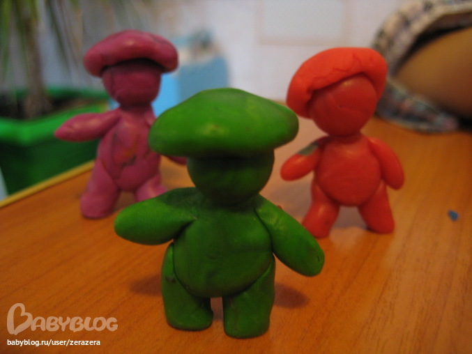 История пластилиновая про зеленого, красного и сиреневого человечков. Жили они в жаркой стране, где просто необходимо носить шляпу от перегревания. У красного и зеленого были панамки, а у сиреневого-нет.