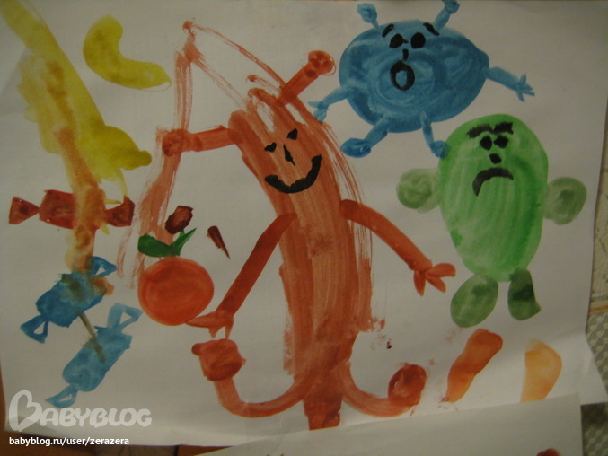 А здесь у зеленого плохое настроение, потому что зубы болят - конфет много ест. (Макар целыми днями выпрашивает конфетку). А красный веселый, потому что вместо конфет ест фрукты и овощи. Вот! История стара как мир.