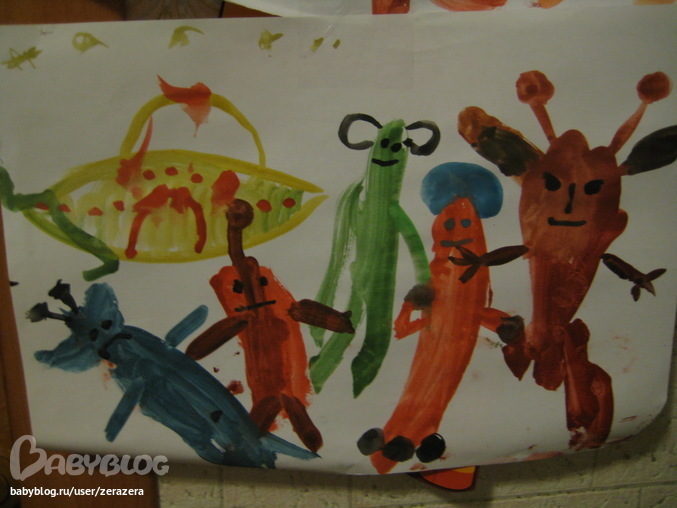 Это для того, чтобы объяснить откуда пошли следующие персонажи. Мой ребенок любит рисовать, но недолго и неумеючи, так каляки -маляки. А тут еще и краски. Раньше я его рукой пыталась выводить более выразительные сюжеты, но ему не нравится - вырывает руку из моей. Потом дала вольную, так самому быстро надоедает. Смотрела на его художества и думала, ну на что хоть отдаленно похоже, чтобы пририсовать, дополнить и таким образом, поддержать интерес. Все глаза просмотрела. И тут всплывает в голове - ЧУДИКИ! Так и появились инопланетяне.